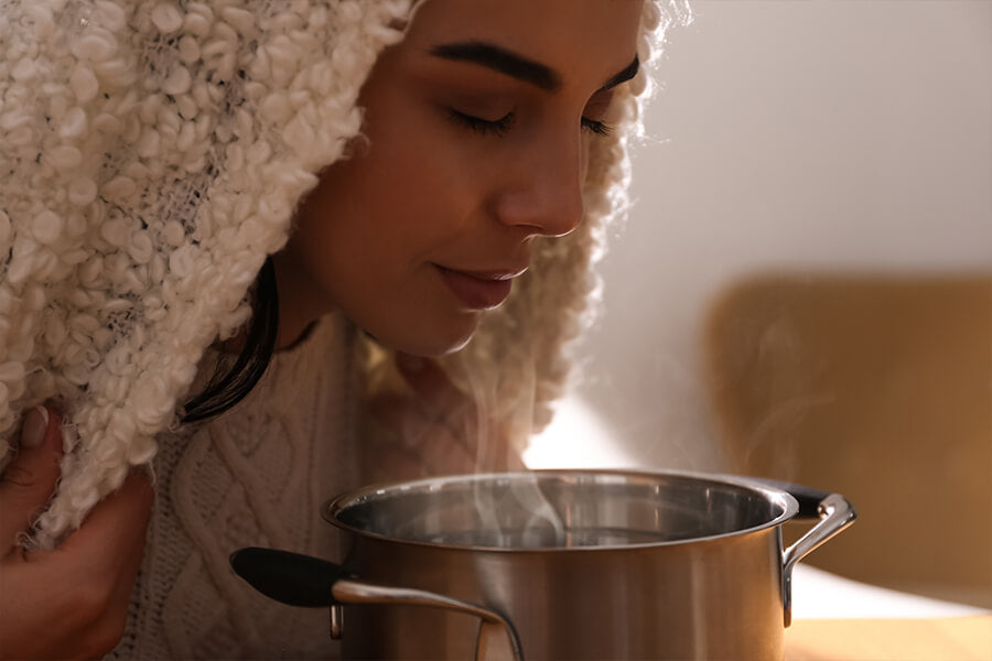 A bad cold and a blocked nose can make even a monk cranky. Steam inhalation helps alleviate the effects of sinus and chest infections. Add about 5 drops of a minty essential oil such as Peppermint or Lavender oil to a bowl of steaming hot water, cover your head and the bowl with a towel, and breathe in the steam deeply for a minute.