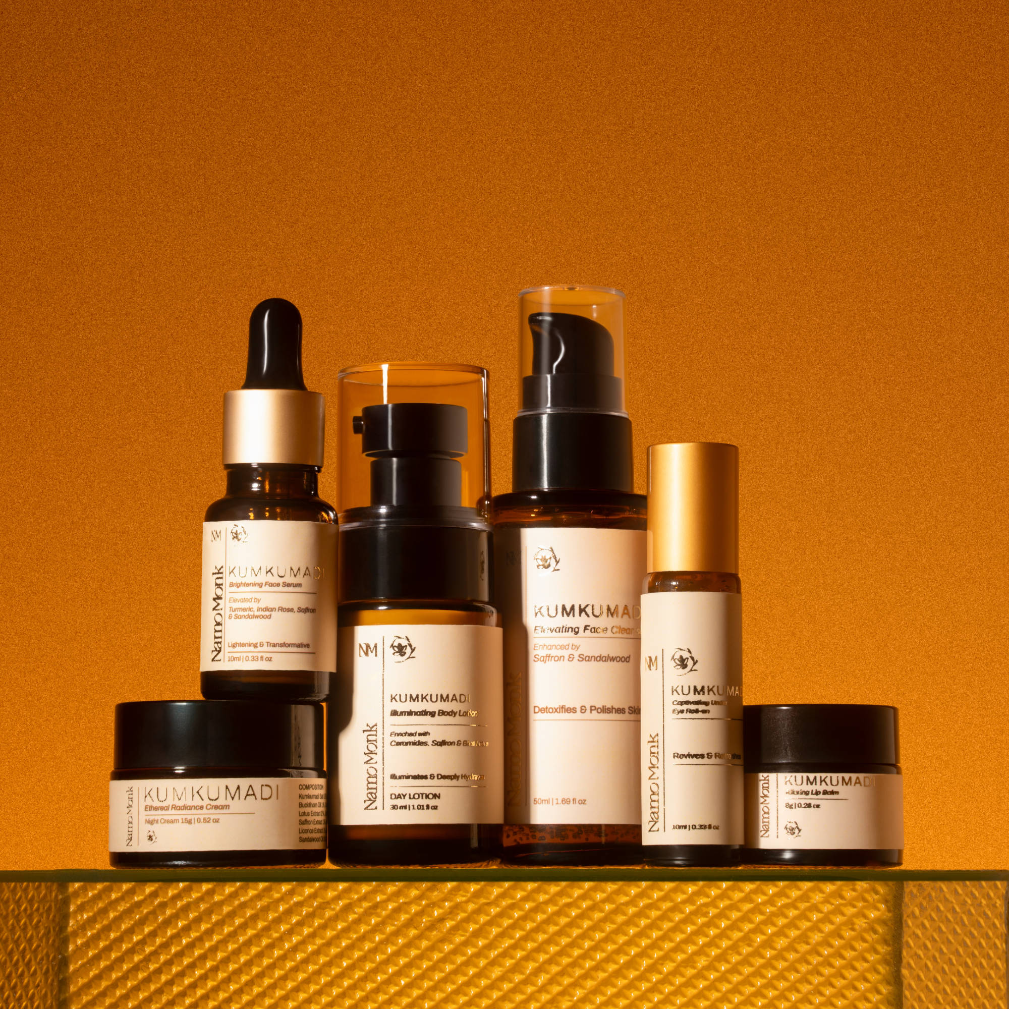 Kumkumadi Duo distils radiance to two essentials—each steeped in Kashmiri saffron, red sandalwood and lotus to soften tone and restore calm. curated in one keepsake box, Hand-crafted, swathed in your choice of handwoven fine Indian fabrics, finished with a reusable tasselled tie.